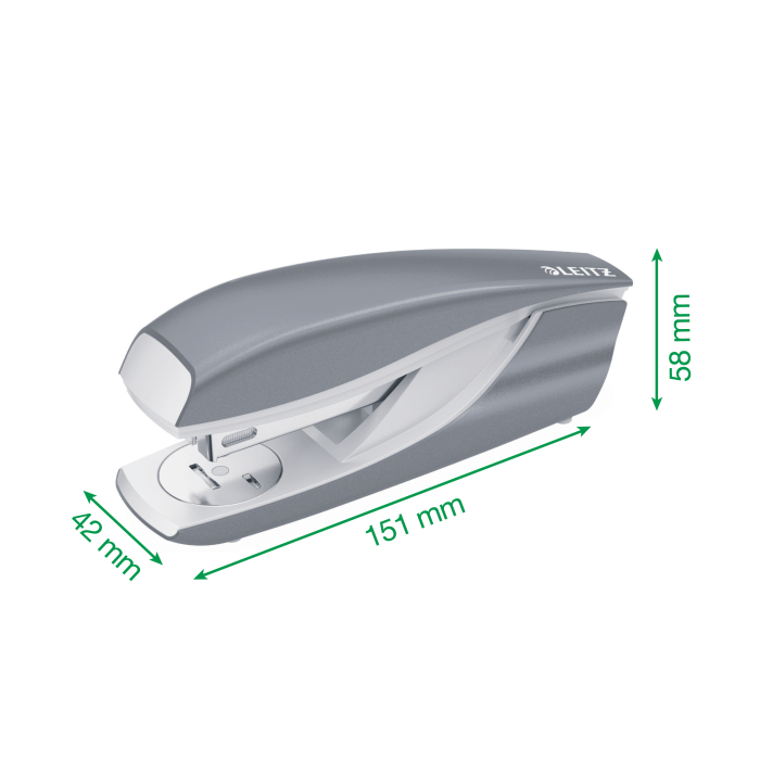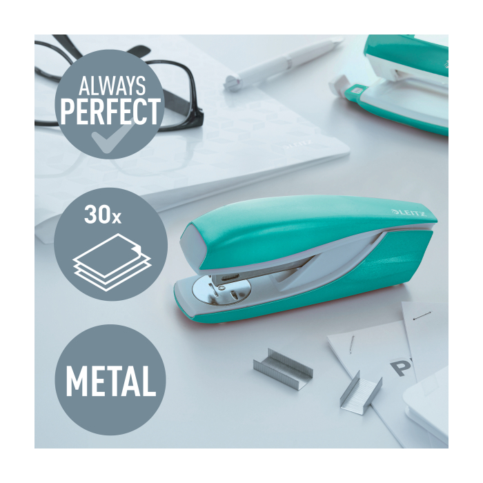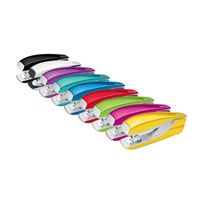 Pevná a spoľahlivá celokovová zošívačka. V farbách radu Leitz WOW a s patentovanou zošívacou technológiou. Základňa z kovu, rameno kov/plast. Protišmykové plastové dno proti poškodeniu nábytku. Kapacita zošívania: 30 listov (80 g/m2).