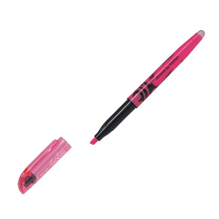 Prepisovateľný zvýrazňovač plnený špeciálnym atramentom. Môžete zvýrazňovať, mazať a opäť zvýrazňovať toľkokrát ako chcete. Zvýraznenie zneviditeľníte zahriatím na 65 stupňov, ktoré dosiahnete trením plastového zakončenia zvýrazňovača po papieri. Text sa znova objaví pri teplote nižšej ako −15 stupňov. Farba tela vo farbe náplne. Väčšie balenie 12 ks v jednej farbe. Farba ružová.