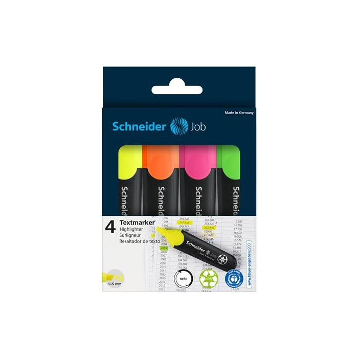 Schneider Job vysokokvalitný zvýrazňovač v sade 4 ks v ekologickom obale