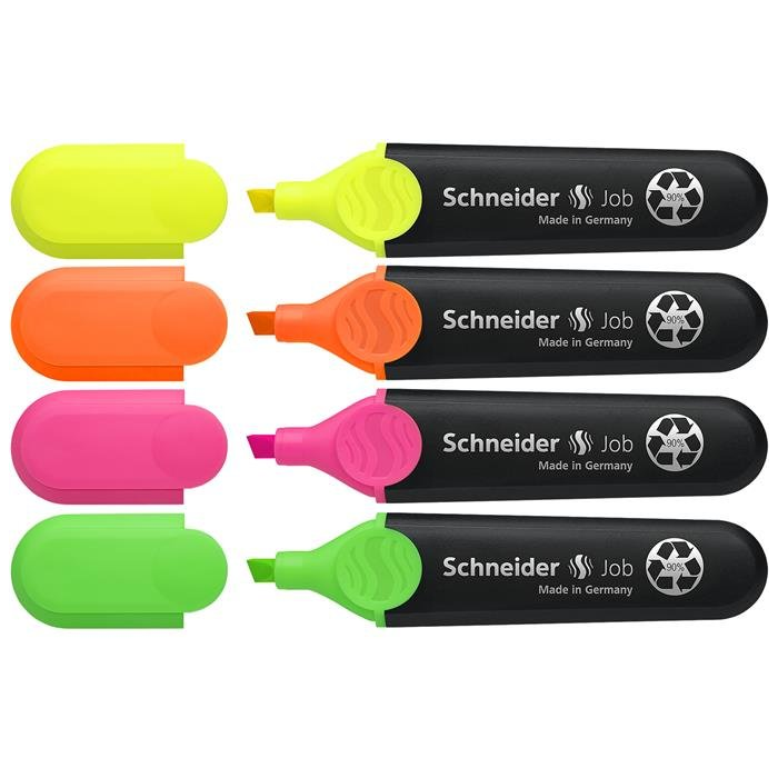 Zvýrazňovač Schneider Job v žiarivých farbách pre zvýraznenie textu v sade 4 ks